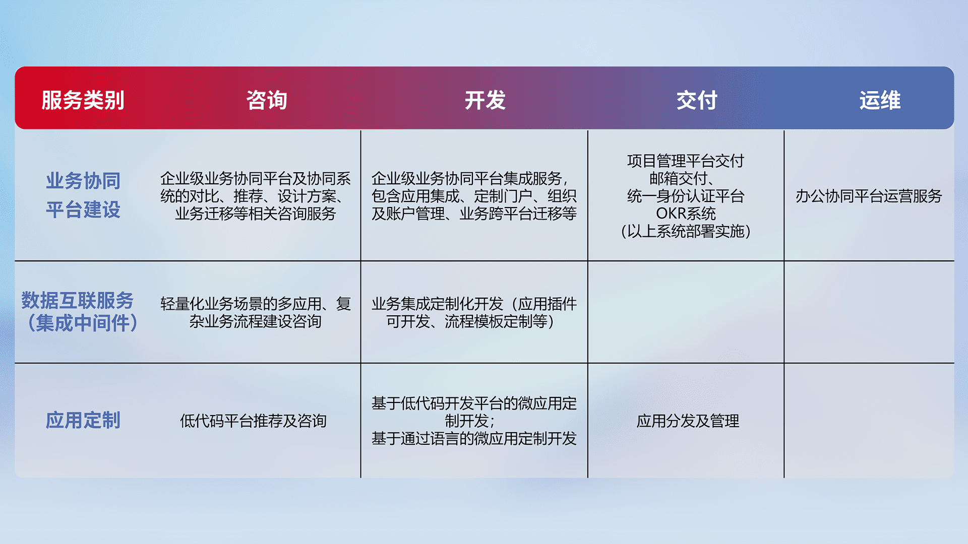 针对钉钉、、企微、、、、IDaas等平台级产品提供产品的规划、、方案、、、、交付、、、定制化开发等服务,,实现如统一协同办公、、智能客户服务、、、混合会议管理、、智能数据查询、、、等业务场景,,,,实现数字化转型。。
